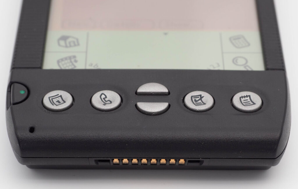 Handspring, an offspring (!) from Palm/USRobotics/3Com in 1999, basically took the Palmpilot design and made some small changes to it. The biggest change was the introduction of an expansion-port where you could put “Springboards”, proprietary expansion modules. You can see it in one of the pictures above. It also featured some enhancements to PalmOS, including a better addressbook and “City times”. The 2MB “Solo” model featured on this page was later followed by the 8MB Visor Deluxe and slightly faster Platinum, the Prism featuring a color display, the slim Edge, the lower-priced Neo and finally the 16MB Visor Pro that unlike the previous models had a built-in rechargeable battery. Visor Pro was the last “pure” PDA from Handspring. It was followed by the Treo line of more communications-centric organisers. In 2003 Handspring “re-merged” with Palm to help further develop the Treo line combined phones and PDAs. Although the connector on the bottom edge of the PDA seem to match the connector on the sync-cradles from Palm, you still cannot use a Palm cradle to sync this PDA, because the shape of the underside of the Visor is different than on the Palm Pilot so it will not fit physically.