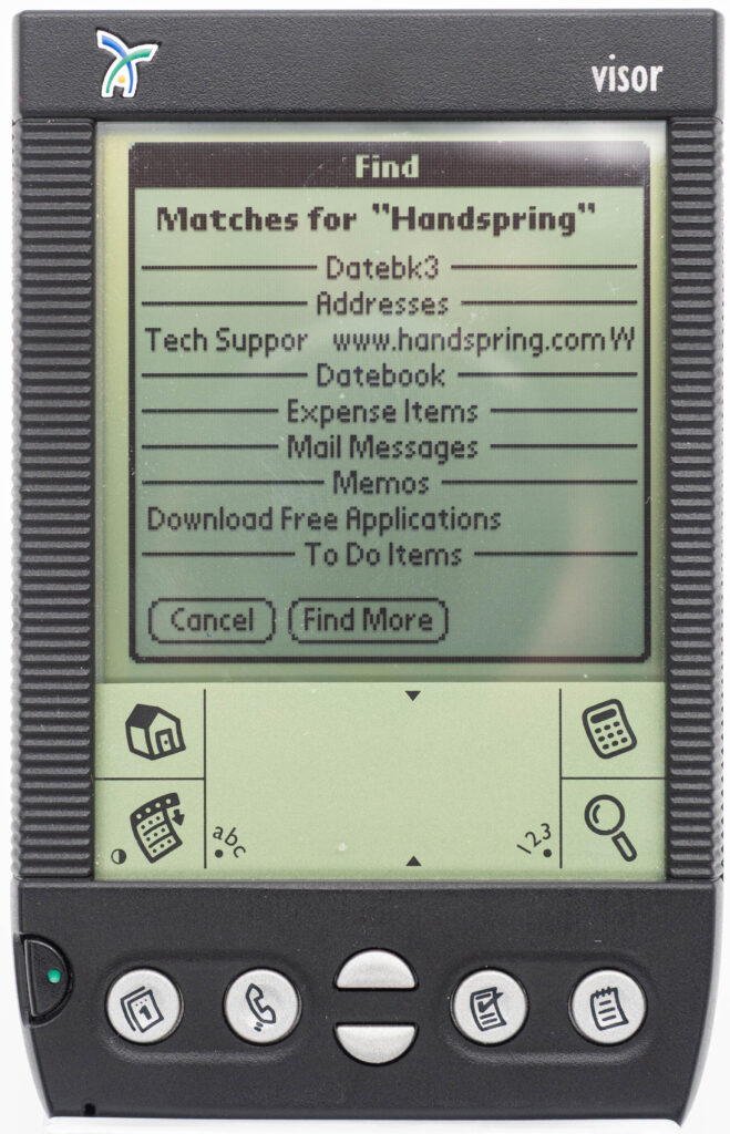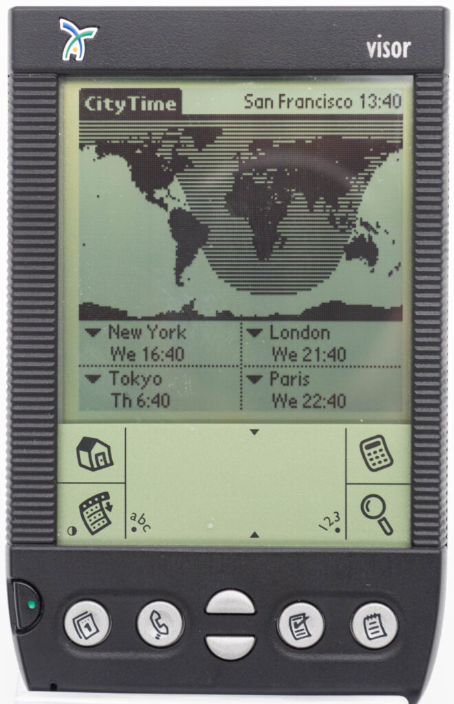 The Handspring Visor featured a slightly enhanced version of PalmOS. The enhancements consisted of an enhanced Datebook, a City Time application and an advanced Calculator. Of course, as it was based on PalmOS, literally thousands of applications were available from the Internet as downloadable files. Considering the limited amount of memory available, it was amazing just how much you could actually perform with one of these.