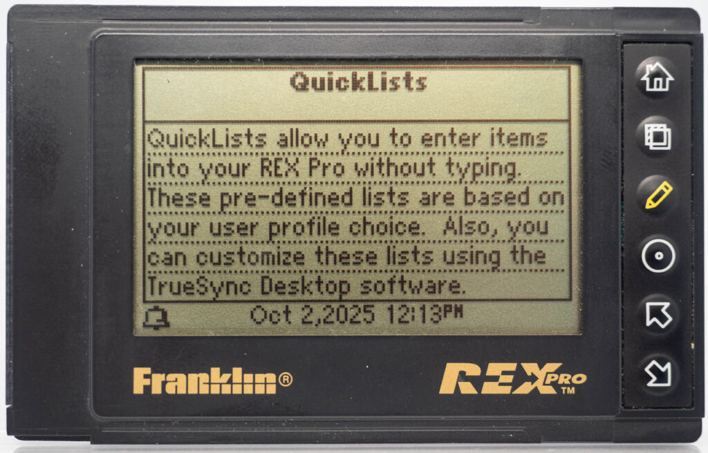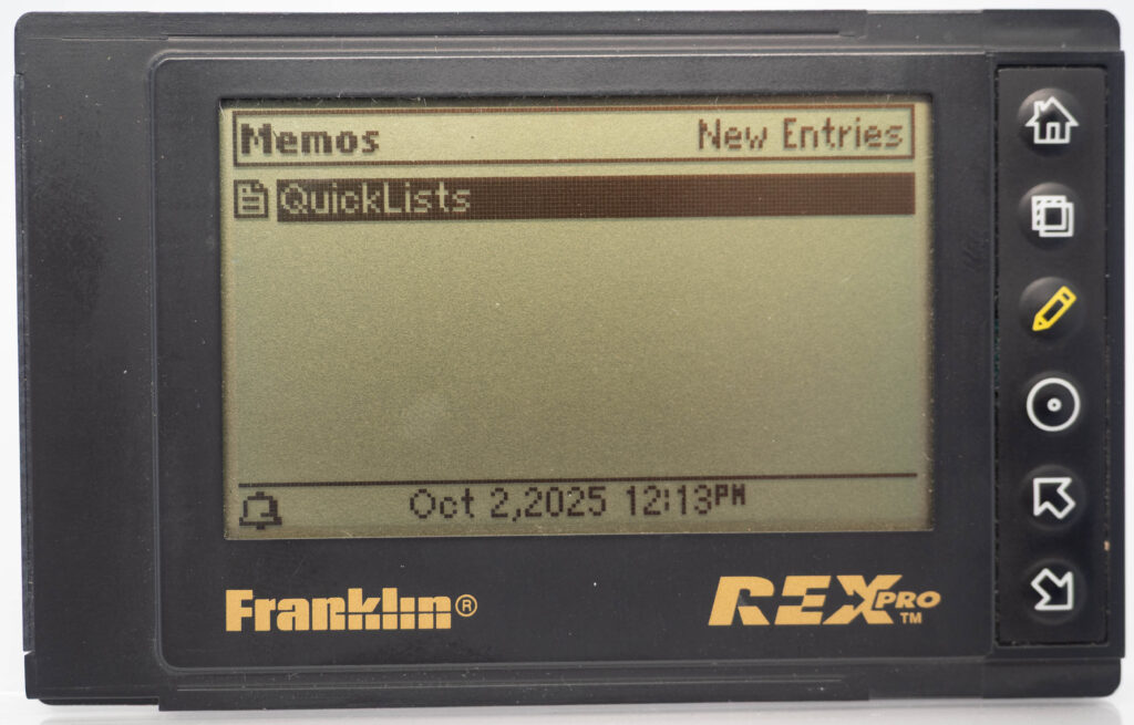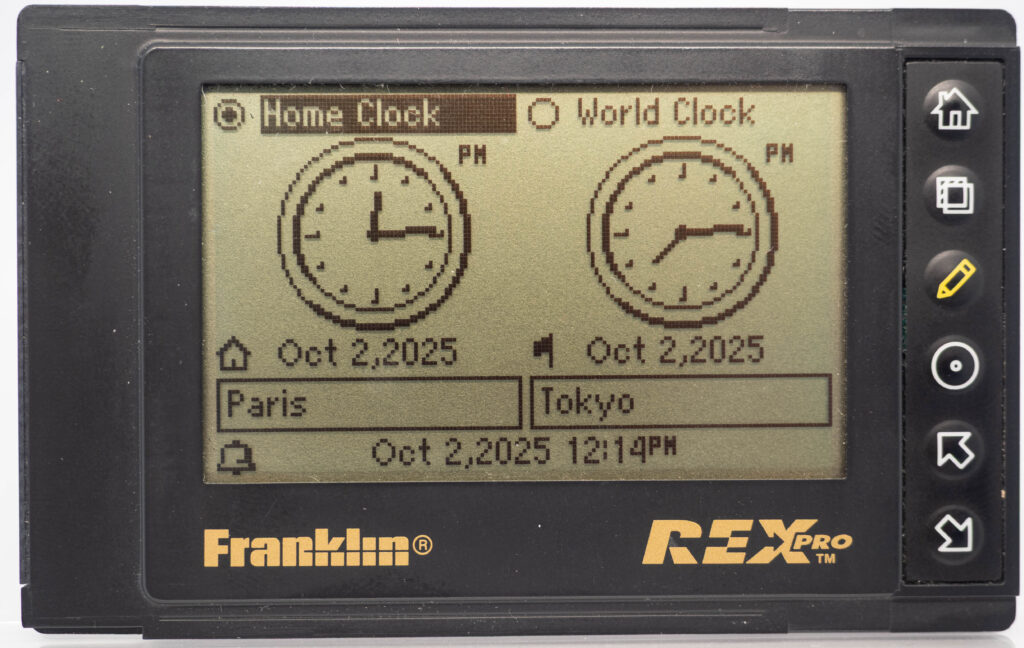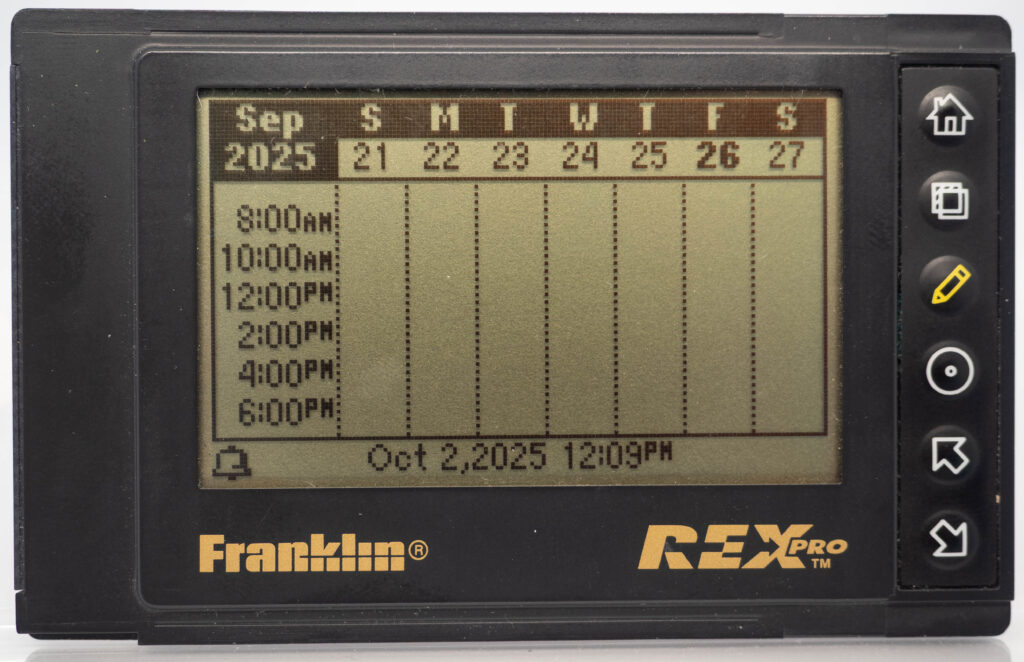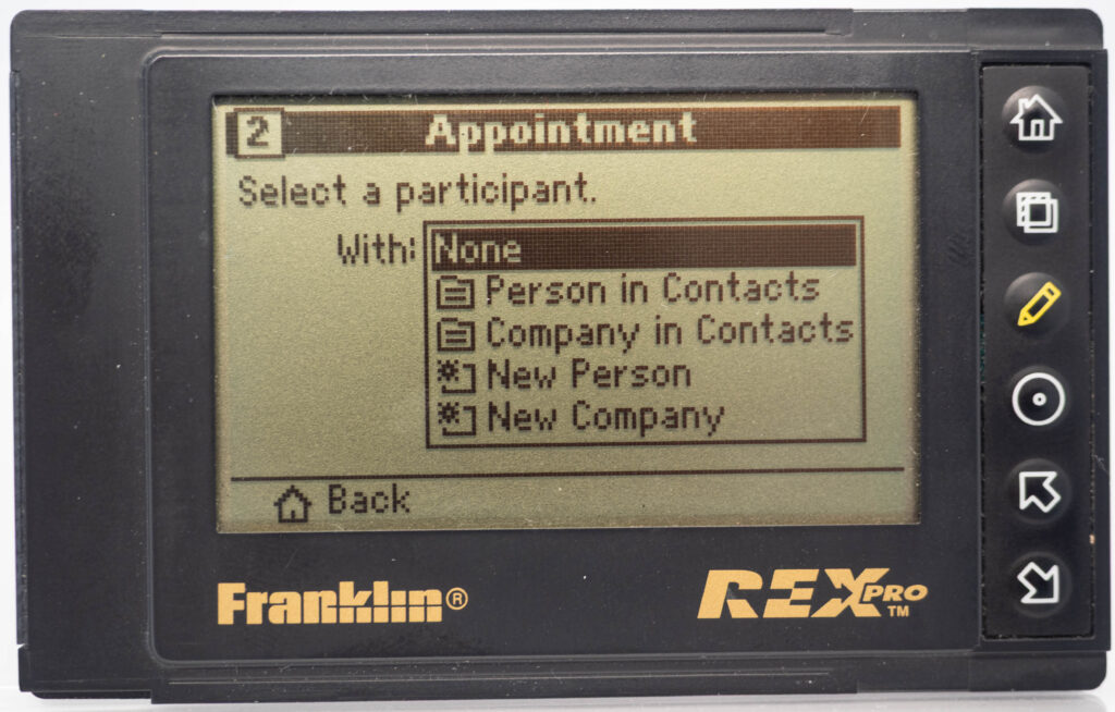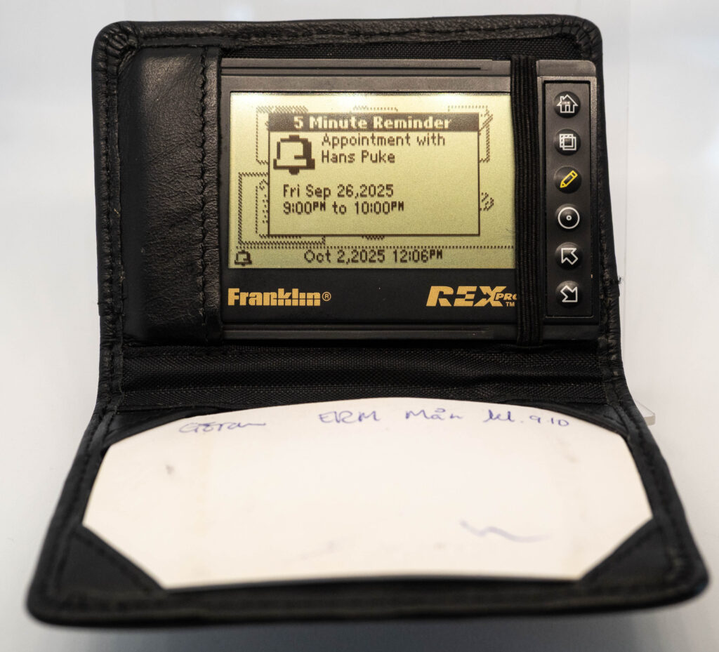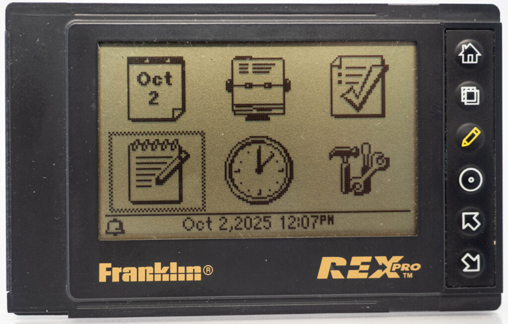 The Rex Pro or REX-5 or Rex 5000 was the successor to the Rolodex Rex (or REX-3). It retains the same size and screen, but adds the very important feature of being able to edit things on-the-go. It still has only 6 buttons (one more than its predecessor), so how on earth do you accomplish editing using only these buttons? The truth is that you would very seldom enter entirely new text on the go. Instead, you would create phrases beforehand, using your PC and load that library of phrases over to the PDA. This capability was referred to as “Quicklists”. Example phrases would be “Meeting with “, “Dentist appointment”, etc. While out and about you could then easily choose one of those phrases for your calendar for instance and complement it with the name of the person you are meeting with (from the address book, or enter it manually, letter-by-letter) and at what date and time. That way it was at least somewhat useful compared to the previous model where you could not enter anything at all while on the go. It also came with a small note-pad as part of its cover. Its successor, the Rex 6000, added pen-input via its touch-sensitive display.