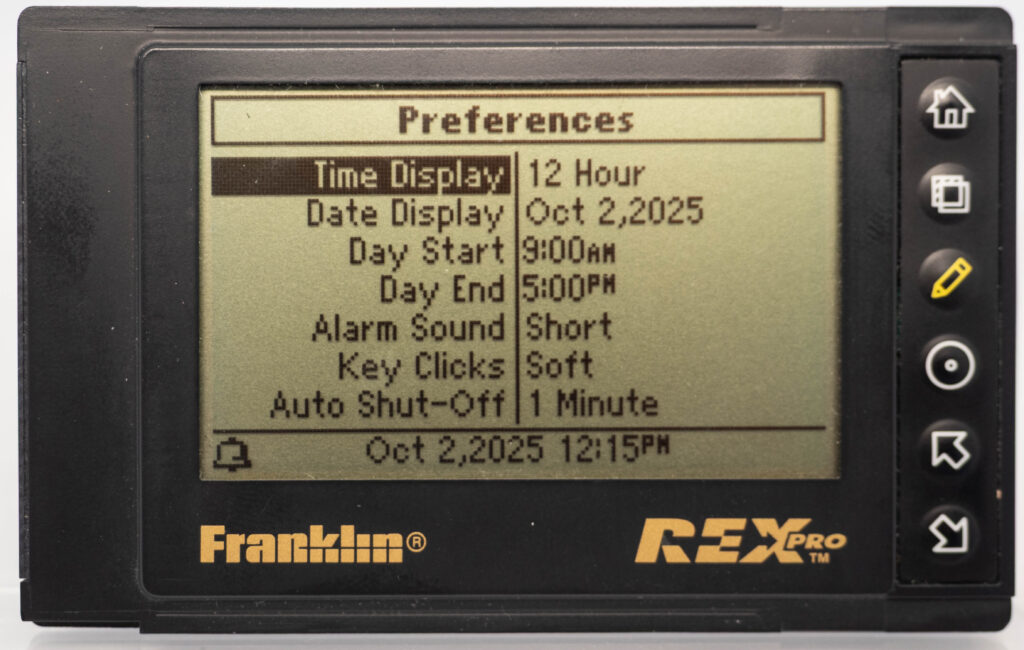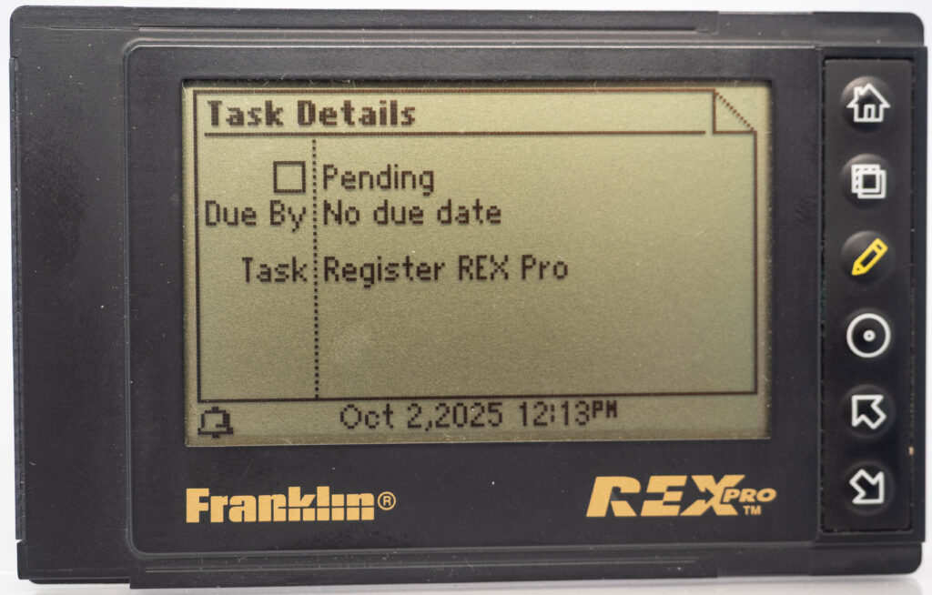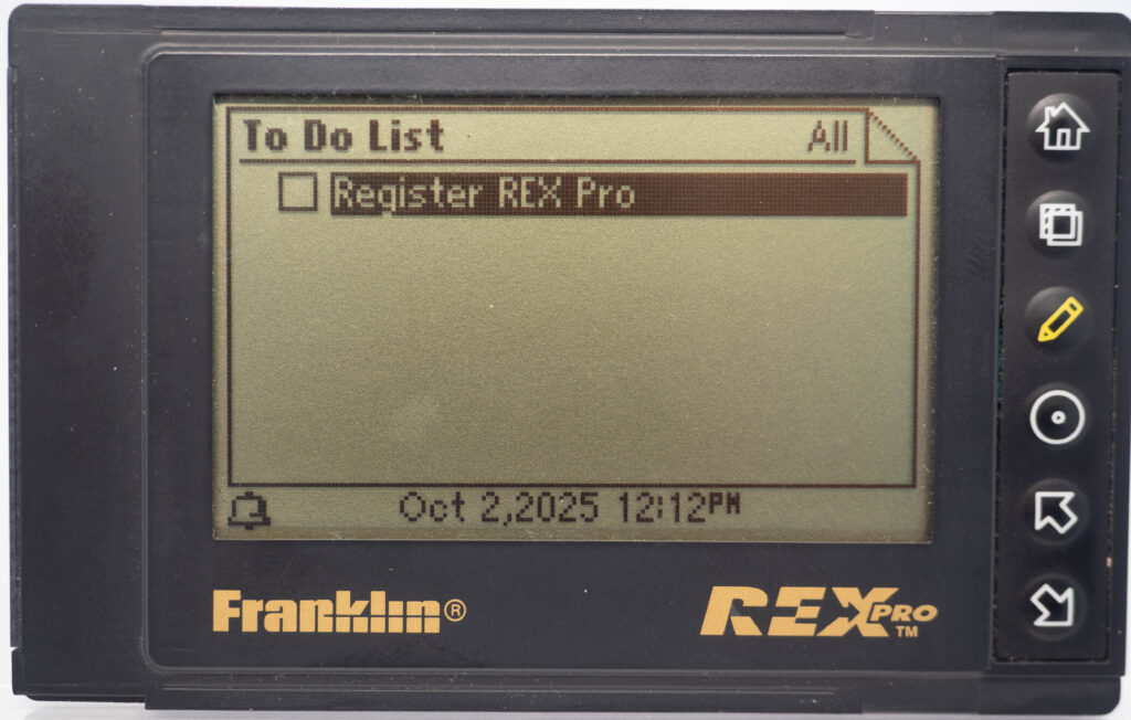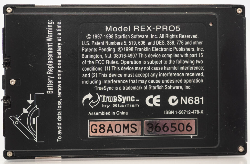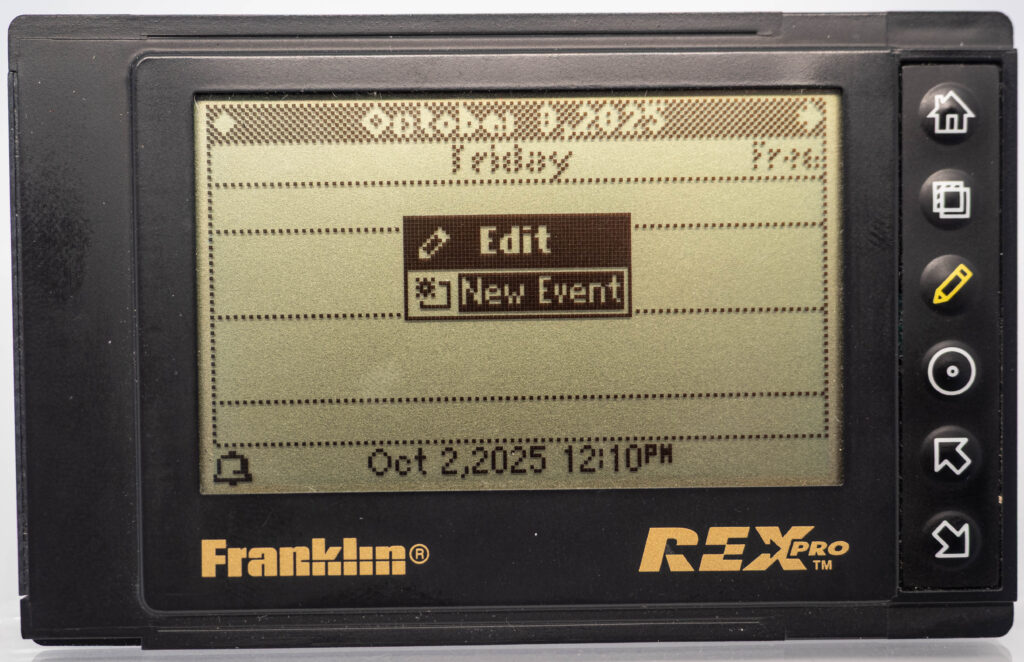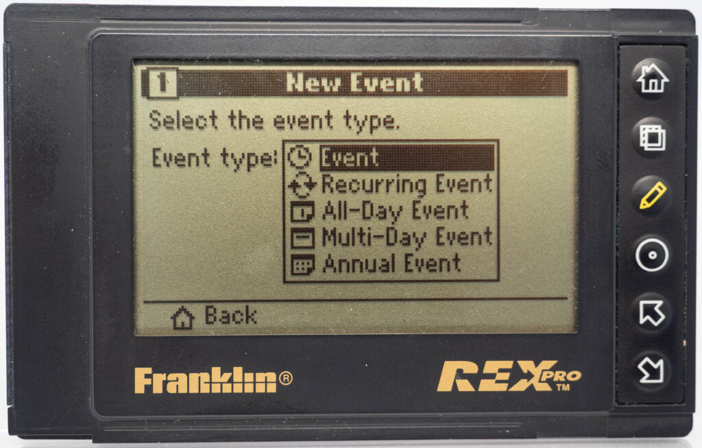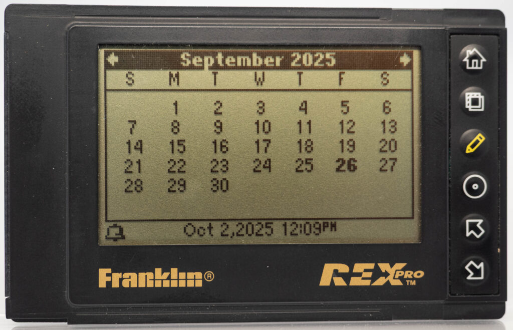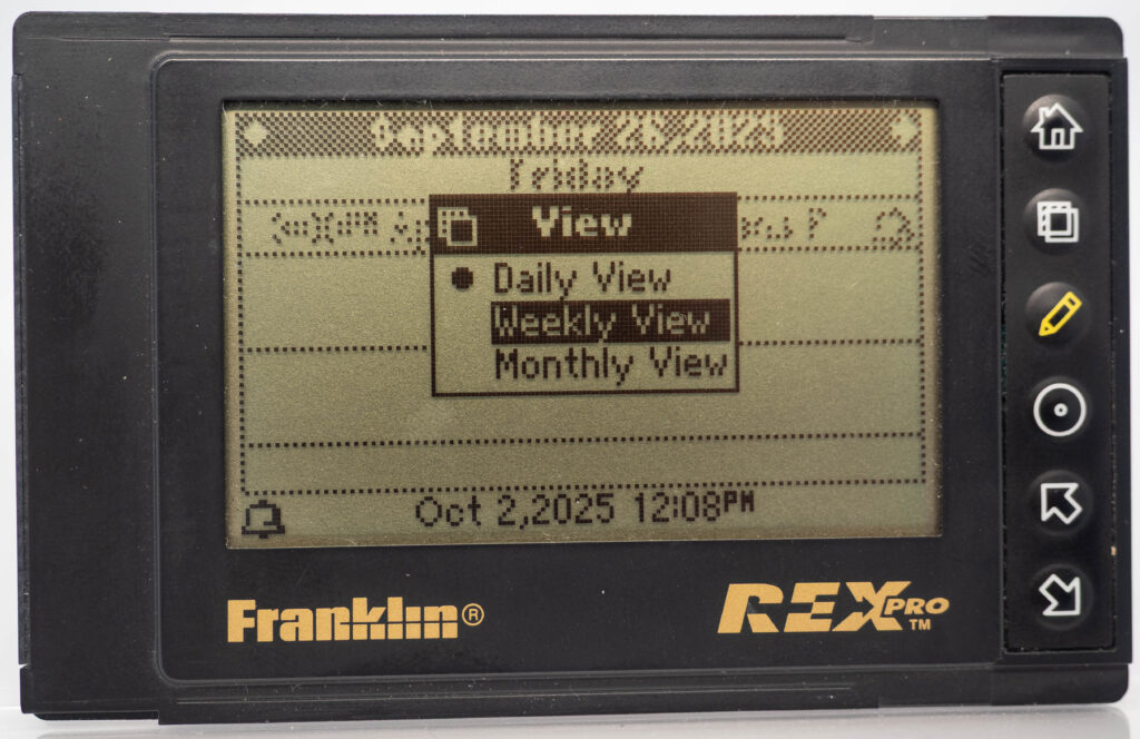 The Rex Pro or REX-5 or Rex 5000 was the successor to the Rolodex Rex (or REX-3). It retains the same size and screen, but adds the very important feature of being able to edit things on-the-go. It still has only 6 buttons (one more than its predecessor), so how on earth do you accomplish editing using only these buttons? The truth is that you would very seldom enter entirely new text on the go. Instead, you would create phrases beforehand, using your PC and load that library of phrases over to the PDA. This capability was referred to as “Quicklists”. Example phrases would be “Meeting with “, “Dentist appointment”, etc. While out and about you could then easily choose one of those phrases for your calendar for instance and complement it with the name of the person you are meeting with (from the address book, or enter it manually, letter-by-letter) and at what date and time. That way it was at least somewhat useful compared to the previous model where you could not enter anything at all while on the go. It also came with a small note-pad as part of its cover. Its successor, the Rex 6000, added pen-input via its touch-sensitive display.