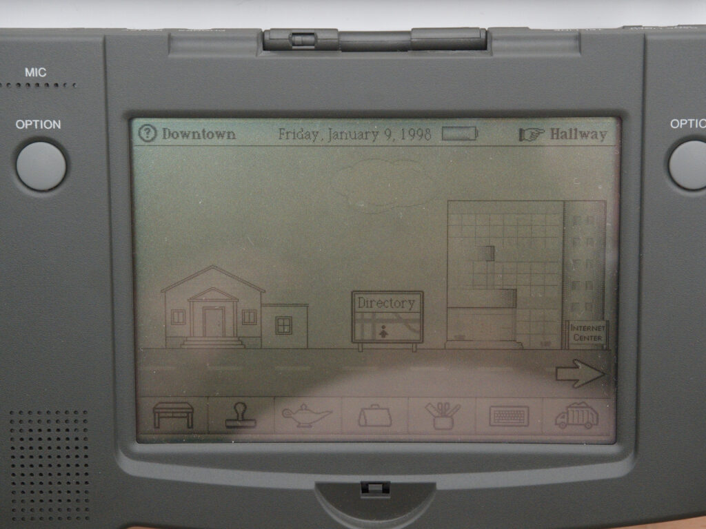 But the desk is only one of several places in Magic Cap. From there, you can move into the hallway, where you will find a directory, storage areas and various other objects. Stepping outside takes you to the street, where you will find the “Internet Center” — the place where you configure connections to an Internet Service Provider.